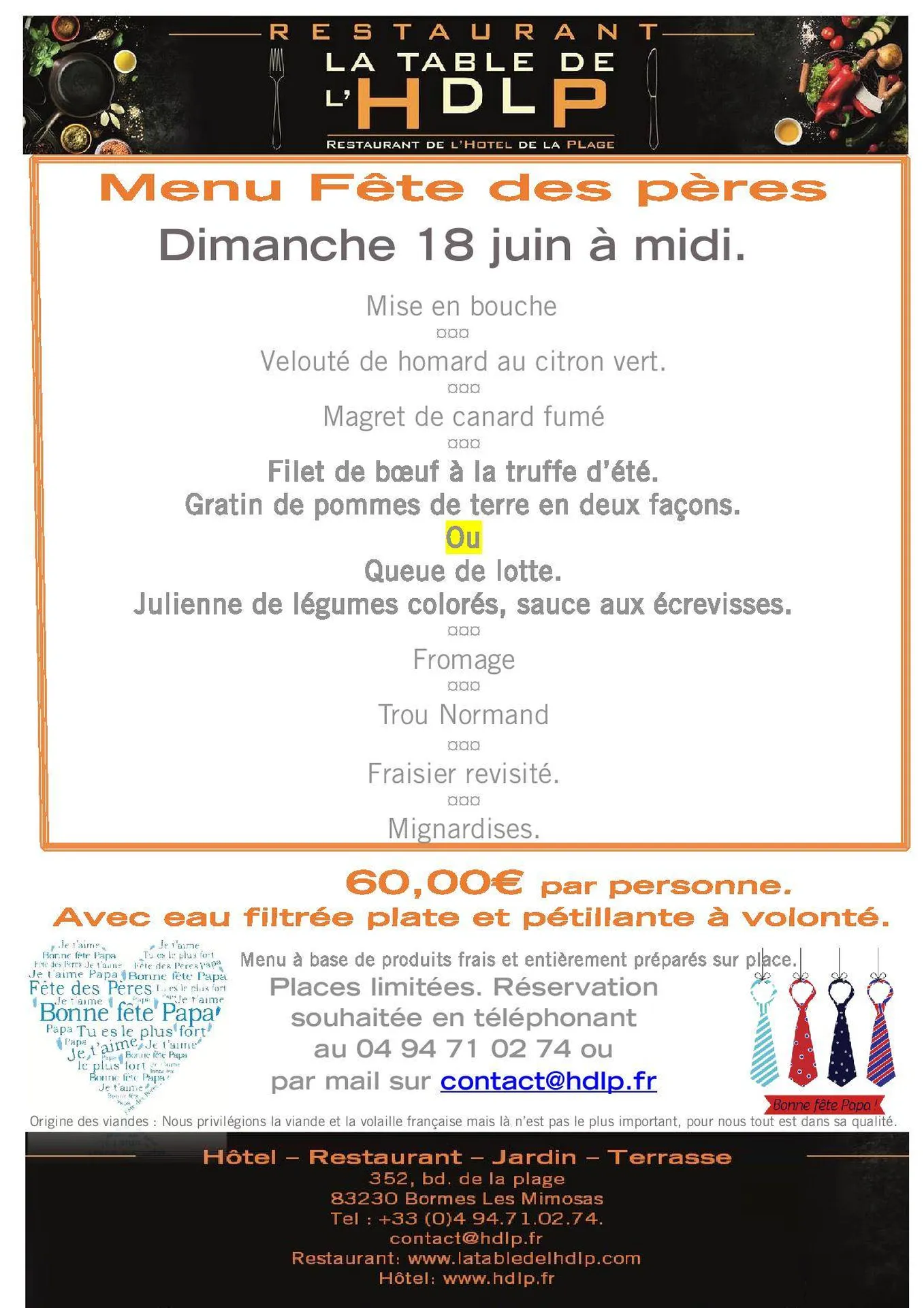 La Table de L'HDLP, notre restaurant, fêtera dignement les papas ce dimanche 18 juin à midi. Un menu en 8 déclinaisons pour marquer cette journée. En terrasse ou au jardin à l'ombre de nos platanes de nos voiles et au son envoutant de notre fontaine. Il est important de réserver en précisant votre choix pour le plat principal. (Bœuf d'Aubrac ou queue de lotte). A dimanche! Anne-Lise et Marc
